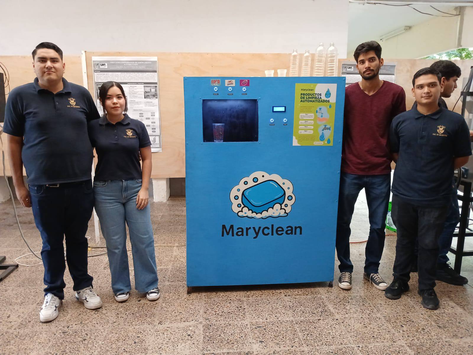 “Nuestro proyecto aquí presente es un dispensador de jabón, tomando como referencia una llenadora de agua, solo que en este caso enfocado a la parte de los jabones líquidos, ya que esta máquina maneja tres distintos productos, un suavizante de telas, detergente y jabón, igual con la misma función de que uno mismo pone su bote y se auto dispensa”, refirió.