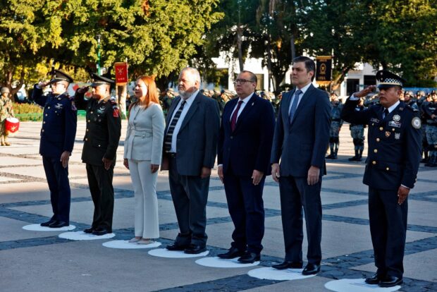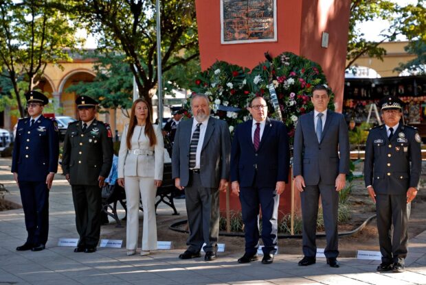 Durante el acto conmemorativo, autoridades de los tres órdenes de gobierno, civiles y militares, hicieron honores a la bandera y entonaron el Himno Nacional, para después presenciar el izamiento a toda asta de nuestro Lábaro Patrio.