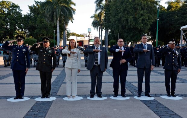 Durante el acto conmemorativo, autoridades de los tres órdenes de gobierno, civiles y militares, hicieron honores a la bandera y entonaron el Himno Nacional, para después presenciar el izamiento a toda asta de nuestro Lábaro Patrio.