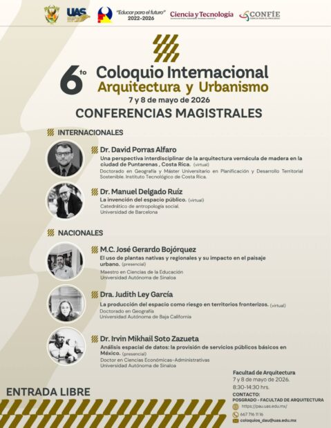 La Facultad de Arquitectura de la Universidad Autónoma de Sinaloa (UAS) se encuentra lista para realizar, los días 7 y 8 de mayo, el 6to. Coloquio Internacional de Arquitectura y Urbanismo, un espacio que busca promover el intercambio académico y profesional de alto nivel.